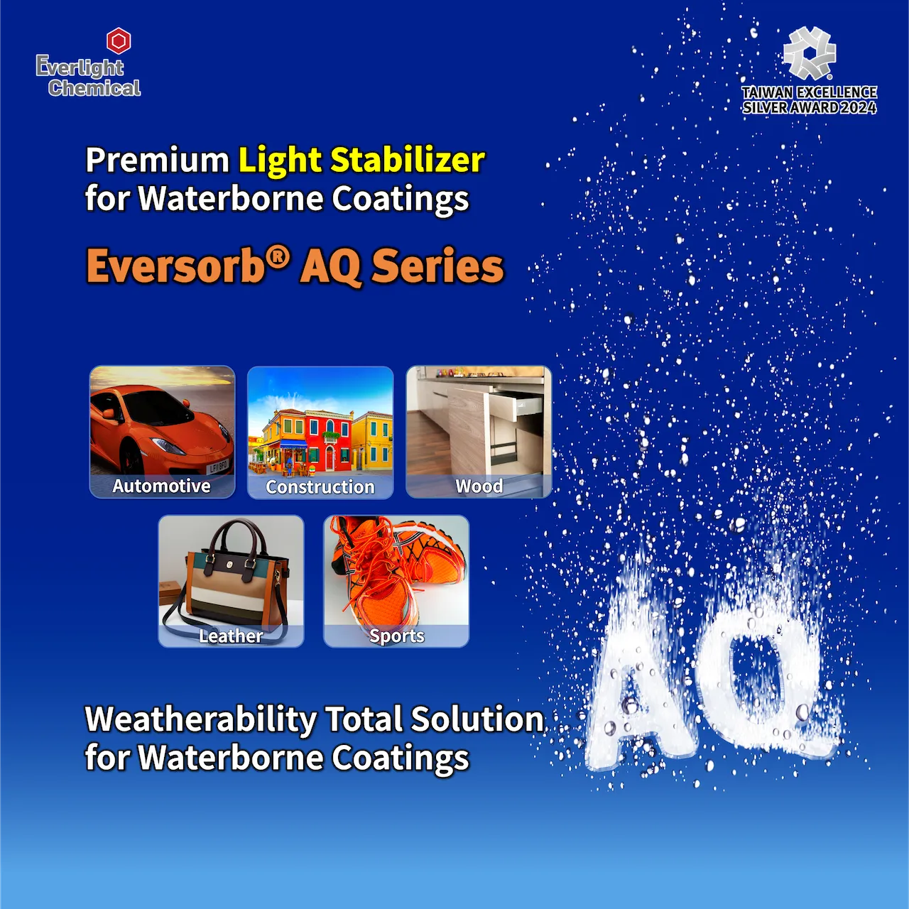 Chất ổn định ánh sáng Eversorb® AQ, sản phẩm với khả năng chịu thời tiết vượt trội cho lớp phủ gốc nước. Lớp phủ gốc nước ngày càng phổ biến nhờ lợi ích về môi trường và lượng VOC thấp, nhưng tiếp xúc lâu với tia UV có thể gây vàng ố, mất độ bóng và đổi màu, ảnh hưởng đáng kể đến thẩm mỹ và tuổi thọ sản phẩm. Everlight Chemical cung cấp chất ổn định ánh sáng Eversorb® AQ như một giải pháp hiệu quả để khắc phục những vấn đề do thời tiết gây ra.