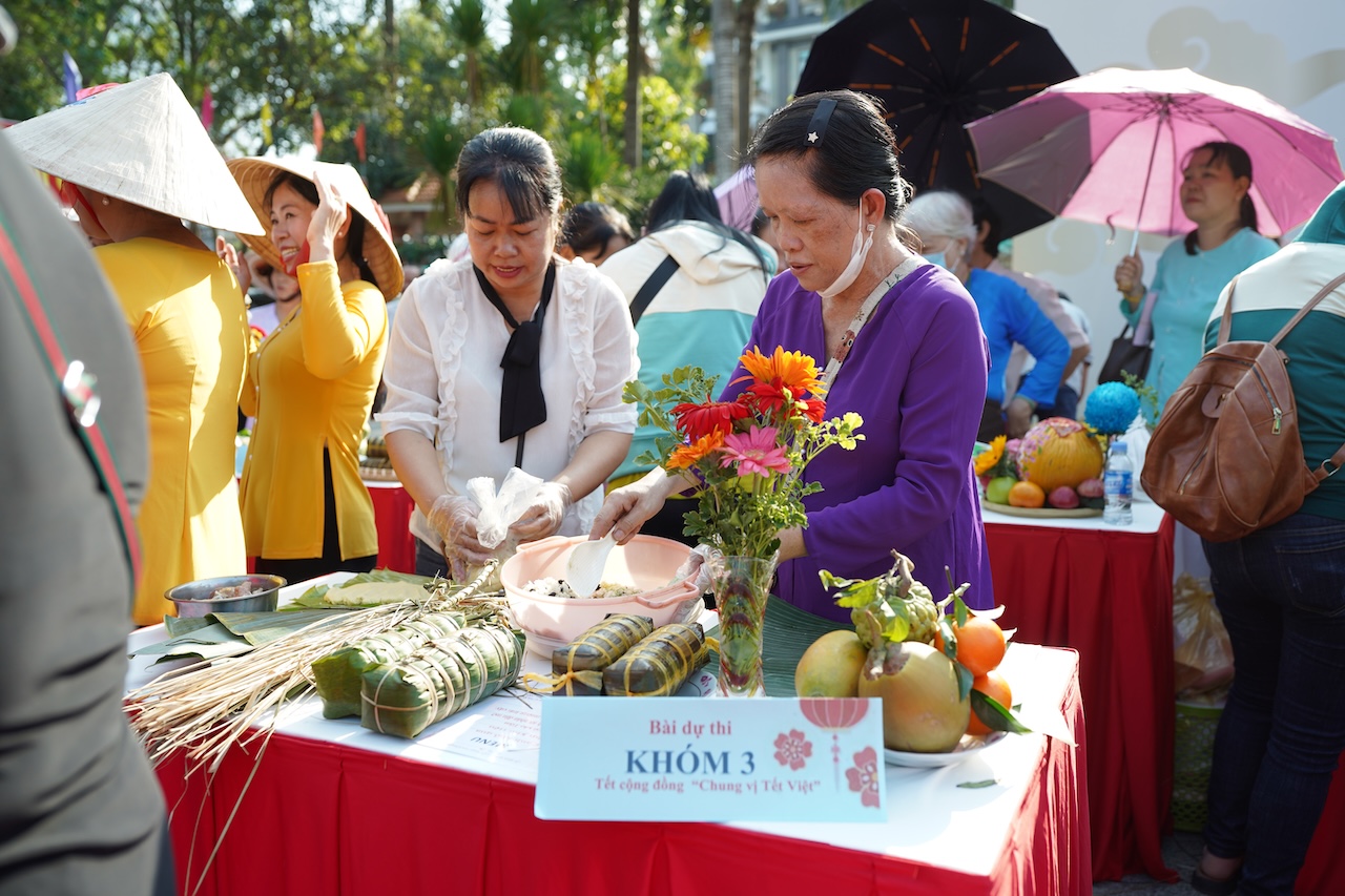 Nổi bật là cuộc thi gói bánh Tét "Vị Phúc Sum Vầy" với sự tham gia của người dân địa phương tại các khu phố lân cận. Trong không khí rộn ràng của sự kiện, các đội thi cùng nhau trải nghiệm gói bánh tét và sắp xếp mâm cỗ Tết. Sự kiện ở Vĩnh Long khắc hoạ đậm nét văn hoá miền Tây với những món ăn ngày Tết mang hương vị đặc trưng vùng sông nước và hoạt động vui chơi Tết quen thuộc như hát lô tô. Qua từng sự kiện “Chung Vị Tết Việt” được tổ chức ở ba miền Bắc - Trung - Nam, người dân có thể cảm nhận rõ sự khác biệt trong phong tục đón Tết và chuẩn bị mâm cỗ Tết. Dù mỗi vùng miền có cách thể hiện riêng, tất cả đều cùng hướng đến một giá trị chung: Tết là thời điểm sum họp, sẻ chia và gắn kết gia đình, cộng đồng.